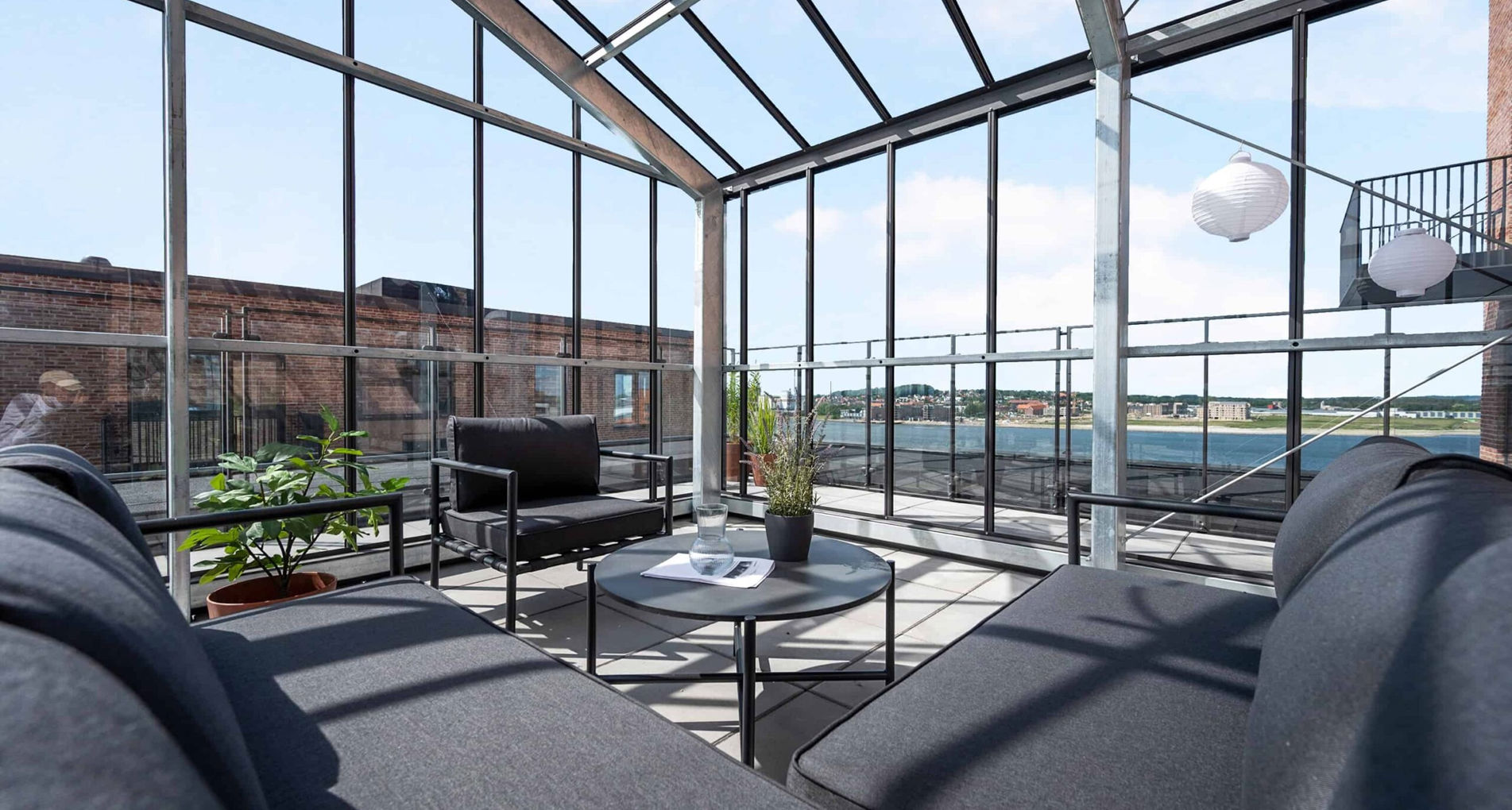 Øverst på Fjordtrappen kan beboerne benytte to fælles tagterrasser, begge med orangeri og grønne udeområder med panoramaudsigt over Aalborg og det omgivende landskab.